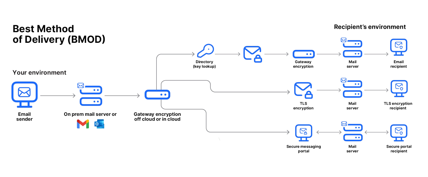 - Automatically selects the best delivery method: S/MIME, TLS, Secure Messaging Portal